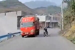 最も不幸な不運。ダンプに引っ掛けられたスクーター乗りが(@_@;)