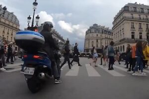 右手前のバイクの人と何か合図をしていたように見えるなあ。何かを拾おうとしたにしてもスタンドを立てずに降りたのでは無理だし。何をしようとしたんだろう?フランス・パリで撮影されたビッグスクーター乗りによる謎な事故のビデオです。