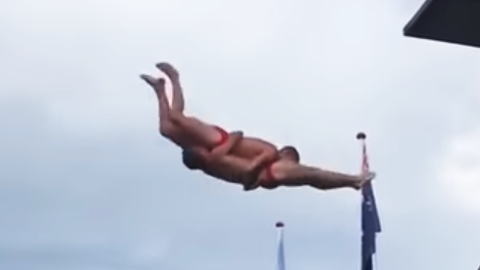 ★躊躇しちゃったのか。飛び込み台からのジャンプに失敗した女性が痛い事に・・・。これは躊躇しちゃったのかな?それとも奥側で別の人が飛んだのでそれにビックリして止まろうとしたんだろうか。二人で一緒にジャンプ⇒一人躊躇というふうにも見える。飛び込み台からのジャンプにしっぱいしてしまった女性が痛い事になるYouTube動画です。これ打ちつけたのはお腹の方で良かったね。背中だったら大怪我していたかも。Tandem High Divers Fail Stunt and Flop Into Pool www