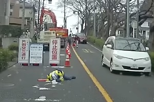 横浜市で交通誘導員がトラックにぶっ倒される事故が撮影される(((゚Д゚)))