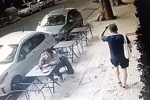 コワー。アルゼンチン・ブエノスアイレスのパレルモで、バーのサイドウォーク席で食事をしていた50歳の男性に4階から落下した窓ガラスが直撃するという事故のビデオです。男性は腕や頭部に20針縫う怪我をしましたが翌日退院しています。