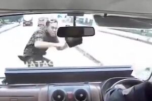 これは避けられんわ。インドネシア中部ジャワ州のスマランで撮影された事故のビデオです。ニュースによるとこの直前にも別の車に飛び込んでいたんだって。男は頭部の怪我で現在入院中。回復を待って警察が取り調べを行うようです。