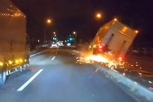 【動画】東名阪道を2時間に渡って通行止めにした足場トラック横転事故の瞬間。