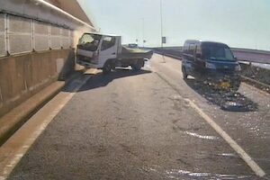 急に車間が詰まった直後だから急ブレーキが原因でお尻を振ったのかしら。東京都葛飾区堀切2丁目の首都高速中央環状線、堀切JCT付近で後続のトラックが壁に激突してしまうという事故のリア側ドラレコです。これ後ろの軽トラも良く避けたね。結構ギリギリだったと思う。