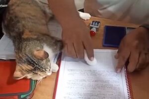 En un colegio Don Bosco, un docente utiliza la patita de su gato para sellar los trabajos de sus estudiantes.😺 pic.twitter.com/ZeVqi3V6iE