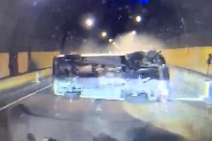 (x.com)(予備)今朝の山手トンネル中野長者あたりの横転事故。夫の車が真後ろで間一髪だったらしい。