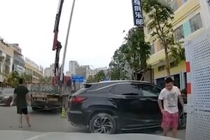 おぎゃあ!KOEEEEE!中国広東省潮州市で、クレーンが吊り上げていた街灯柱が倒れて通行人に直撃。その事故の瞬間を記録していたドライブレコーダーの映像です。ニュースによると手前の車がクッションとなり男性は軽傷ですみました。