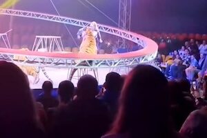 (x.com)(予備)(予備)(予備)(予備)(予備)Тигр выпрыгнул к зрителям во время выступления в цирке в Ростове-на-Дону.