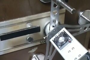 これは【ハイパーオートダイヤラー】という治具で、げ根来鍵屋の私も所持しています。価格は30万円します。当然の如く、まっとうな鍵屋への秘密の展示会(FUKIうあイナホなどの問屋が開催)でなければ購入できませんので、一般の方は入手できません。また、ダイヤルが二つ以上ある古い金庫や業務用のデカい金庫には対応できません。